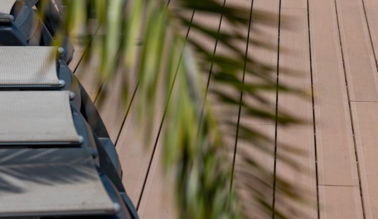Un des points forts de l'hôtel est sa magnifique terrasse en bois composite Atmosphère brun Sao Paulo Silvadec.