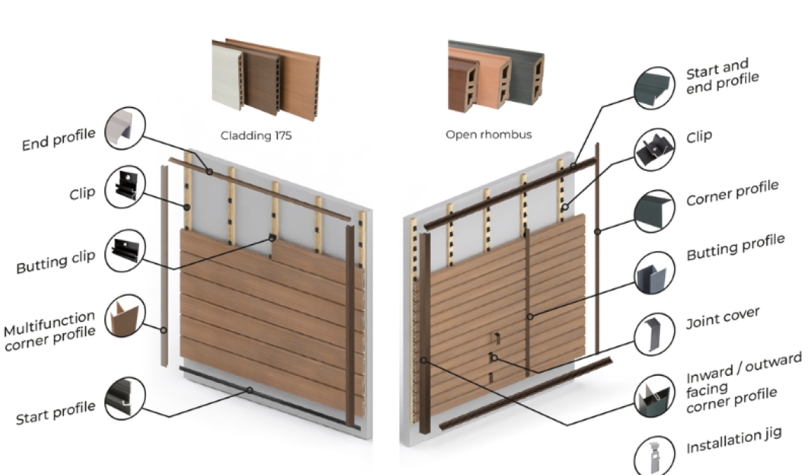 The new Atmosphere 175 cladding board only uses two visible accessories: the end profile and the multifunction corner profile. With the start profile, installation is very simple!