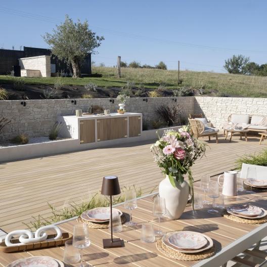 The colour will be given by the decking boards, but also by the objects and accessories selected (cushions, rugs, lighting) and by the garden furniture. Explanations.