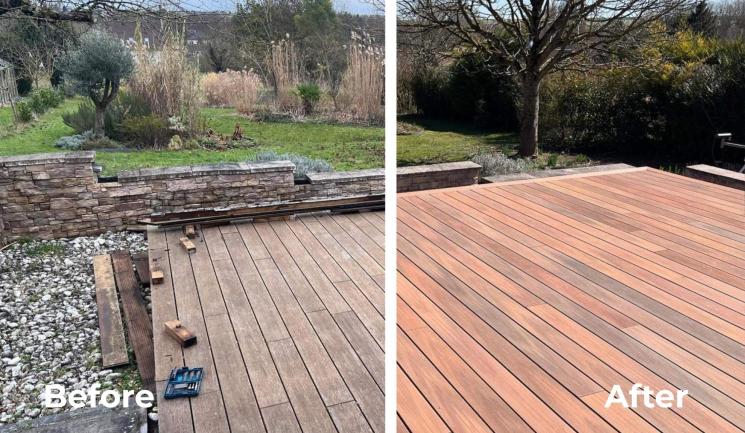 Caption for the trade fair: “It’s a first! Wood composite decking laid in a herringbone pattern. Environmentally friendly and unmatched on durability, it’s the alternative to exotic wood.”